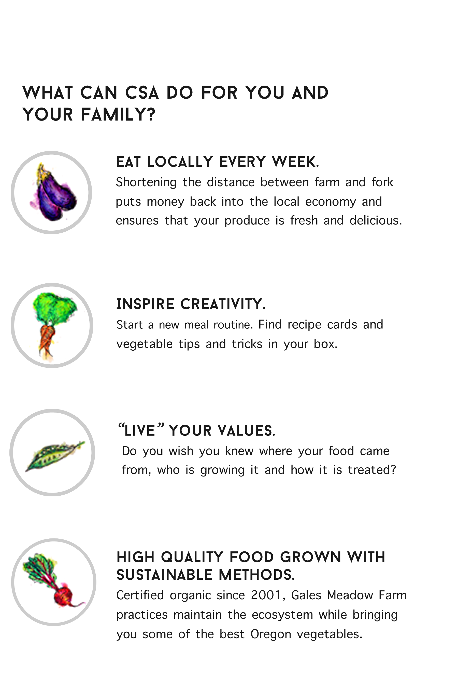 It enables you to eat locally every week. Shortening the distance from farm to fork puts money in our local economy, reduces the consumption of fossil fuels expended in costly food transportation, and reacquaints us with the seasons and rhythms of the earth – if you’re buying blueberries from Safeway in January, they ain’t from Oregon!